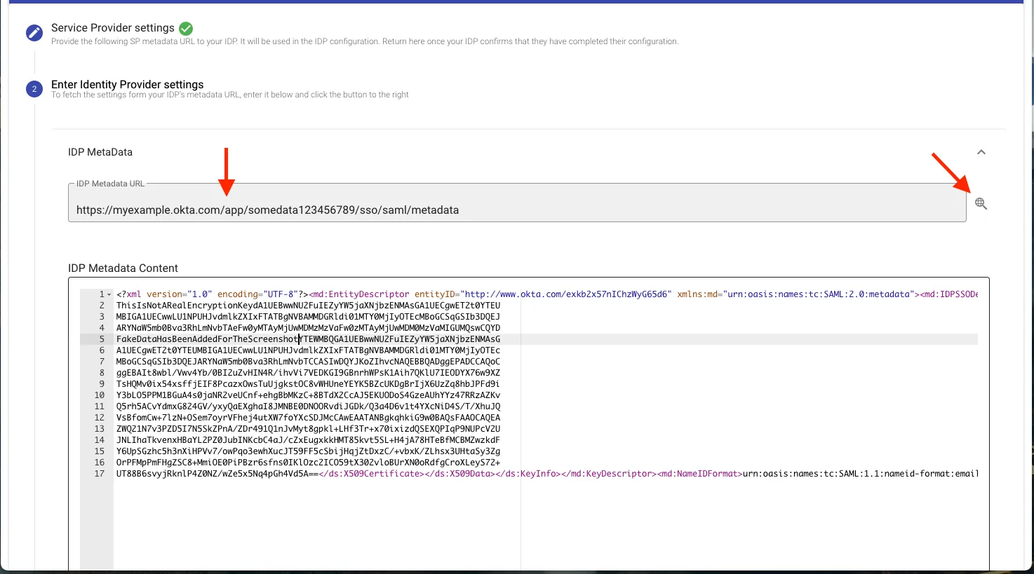 - In step 2 paste the Metadata URL from the Identity Provider application into the IDP Metadata URL box and click the magnifying glass to the right of the URL input box to import the metadata. Alternatively, you can paste any metadata content directly into the IdP Metadata Content box.