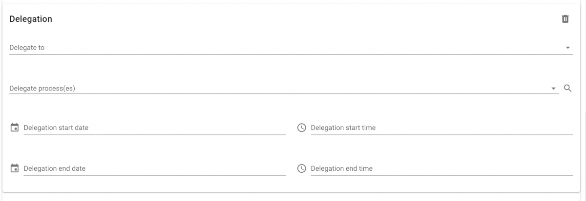Once in the user profile, scroll to the bottom to see Delegation. Here, you will be able to choose who you are delegating the tasks to, which processes, the start and end dates, along with the start and end times for the Delegation.