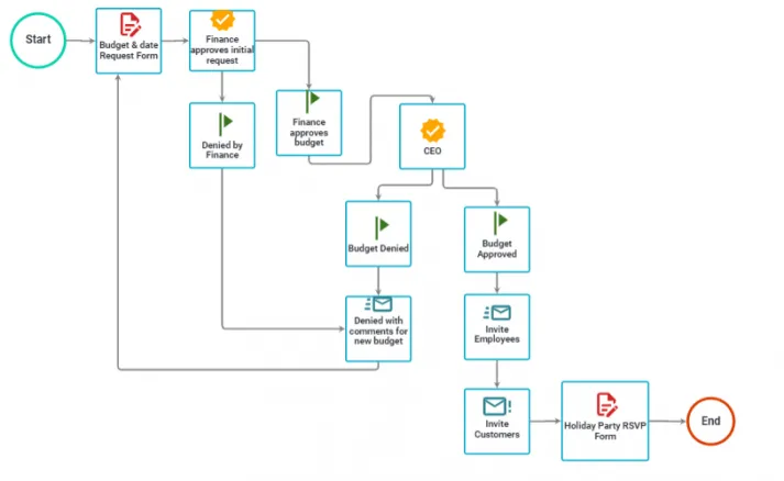 With this holiday party planning process app, your requester will initially send a budget approval form to the organization’s finance department and route this form to the CEO for final approval. After the approval, save the date and RSVP forms will be sent to customers and employees with information about the event, such as the date and location. It’s a simple but efficient way to keep the process moving forward, and no moving parts get left behind.