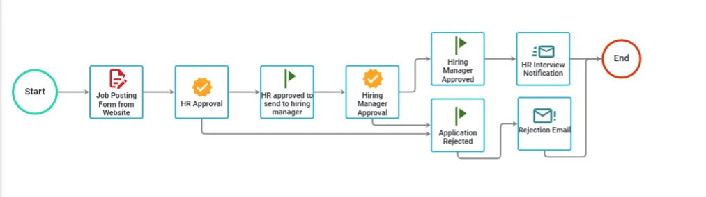 After the form is completed, it’ll be passed to HR for initial approval, routed to a hiring manager, and then sent back to HR for a final interview screening. This process has configured tasks and notification settings and includes completed email templates with approval display notifications configured.