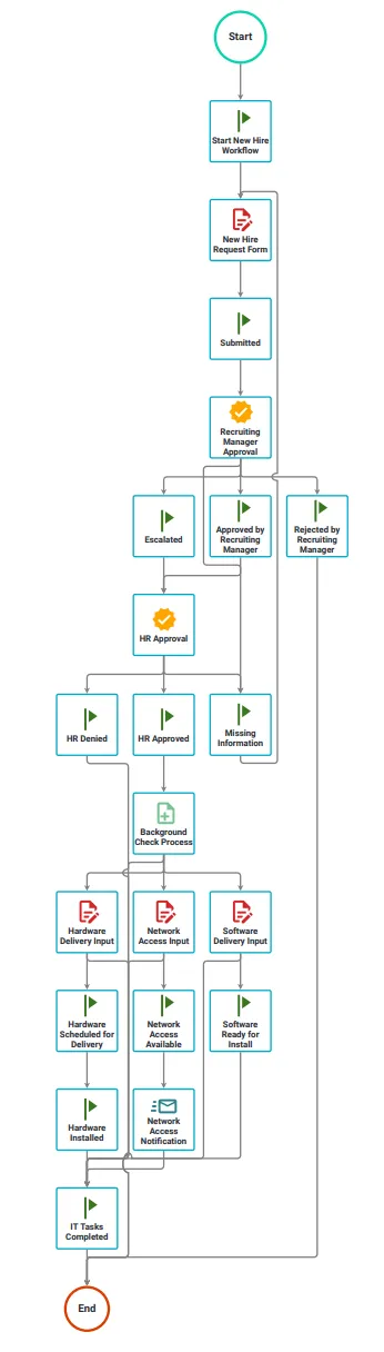 A lot of customers use Workflow Automation to help with the new hire process, as well as onboarding new employees. This is a fairly typical example of how an automated new hire process can work.
