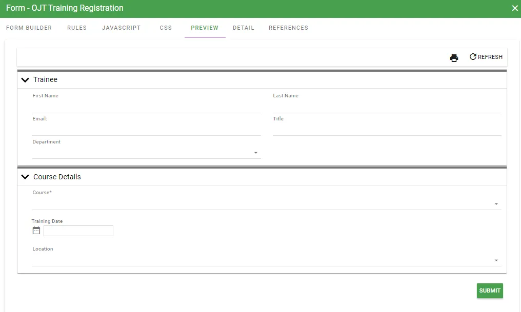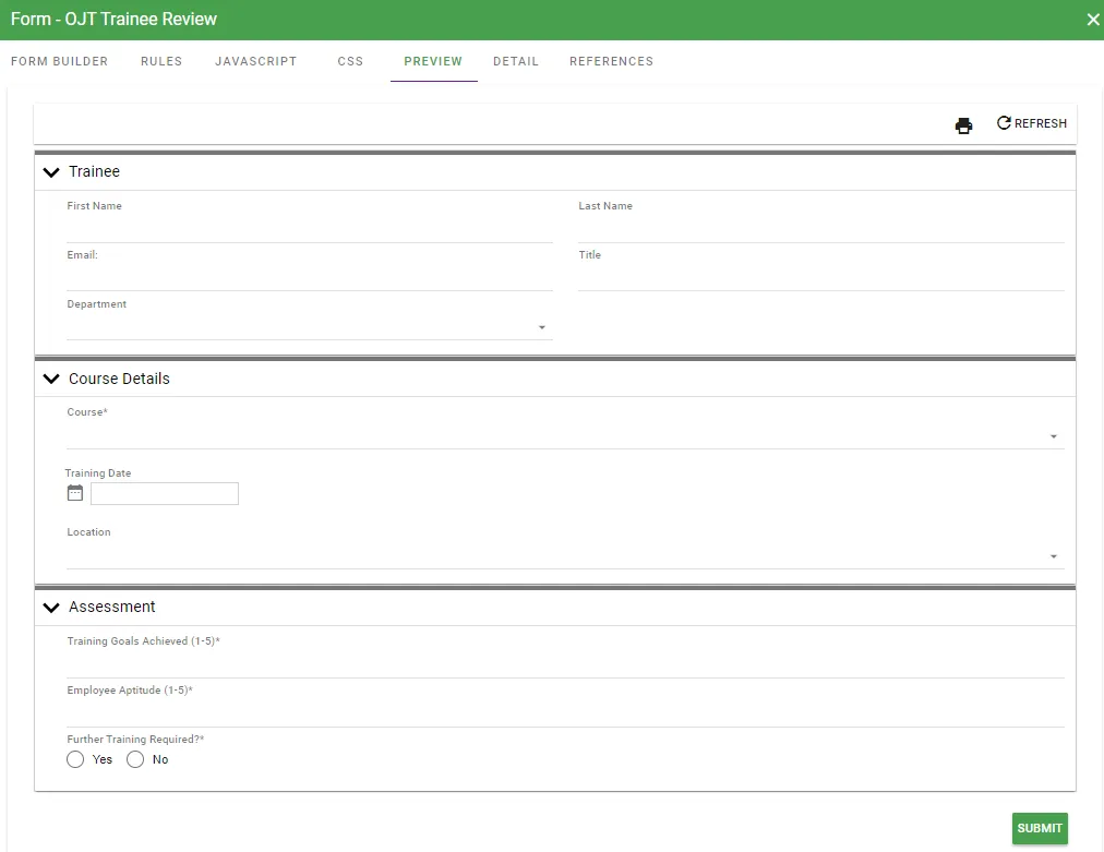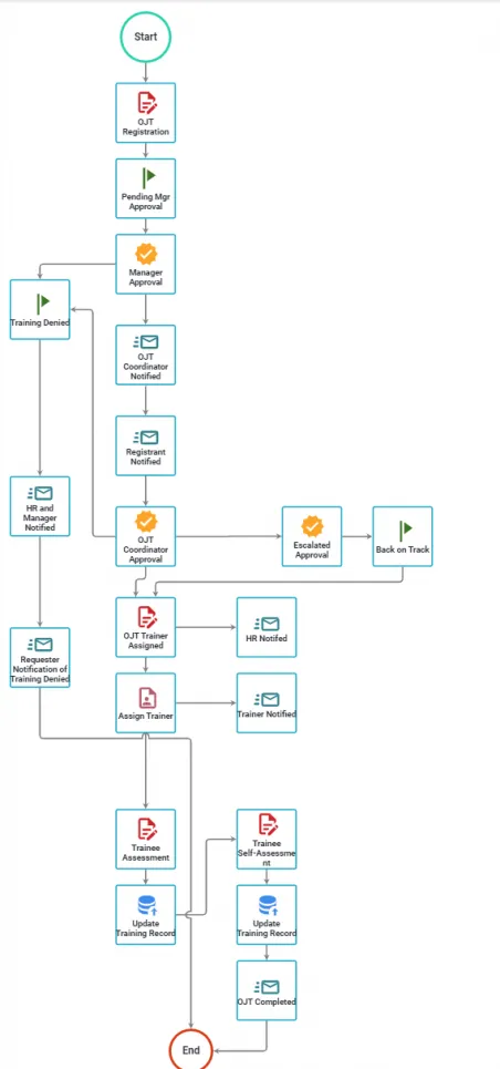 This process app can be used by employers wanting to offer on-the-job training. Requesters begin by selecting their desired course. They’ll be assigned a trainer, the trainer will evaluate them after their time together, and after the trainee performs a self-evaluation, the process will end. Another task already integrated with this process app is the ability to sync up with your database based on the assessments performed by the trainer and trainee.