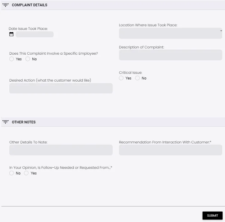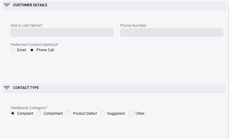 Based on the Feedback Category selected, a section will be displayed for each type.