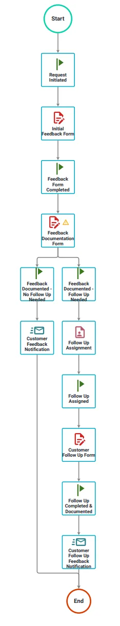 This process allows customer service agents to complete a form any time customer feedback is received and start a process that ensures appropriate followup. As an alternative, this process can be made public facing, allowing your customer base to give anonymous feedback as well.