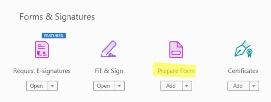 In the Tools window, under Forms & Signatures select Prepare Form, select the file you’re working on or the file you’ve already created, and click Start.