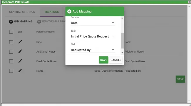 Repeat step 6 for each field. For this example, start with Name. In the Source field, choose Data. For the Task field, choose the form you’re mapping from — in this instance, it’s the Initial Price Quote Request Form. Then select the field on the form that matches your PDF; in this example, Requested By maps to the Name field.