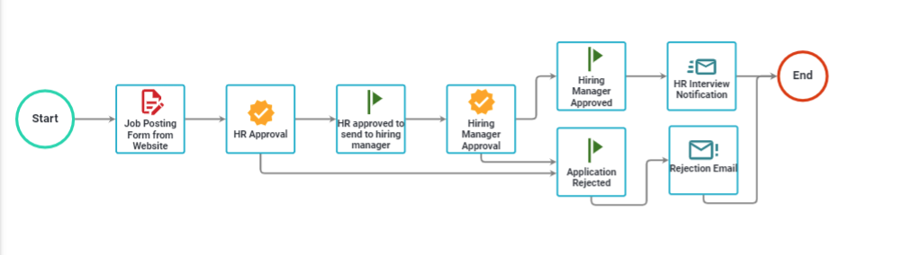 You can update the “Position Applying For” field with available positions from the back-end for end users to select and choose from when applying. After the form is completed, it’ll be passed to HR for initial approval, routed to a hiring manager, and then back to HR for a final interview screening. This process has configured tasks and notification settings and includes completed email templates with approval display notifications configured.