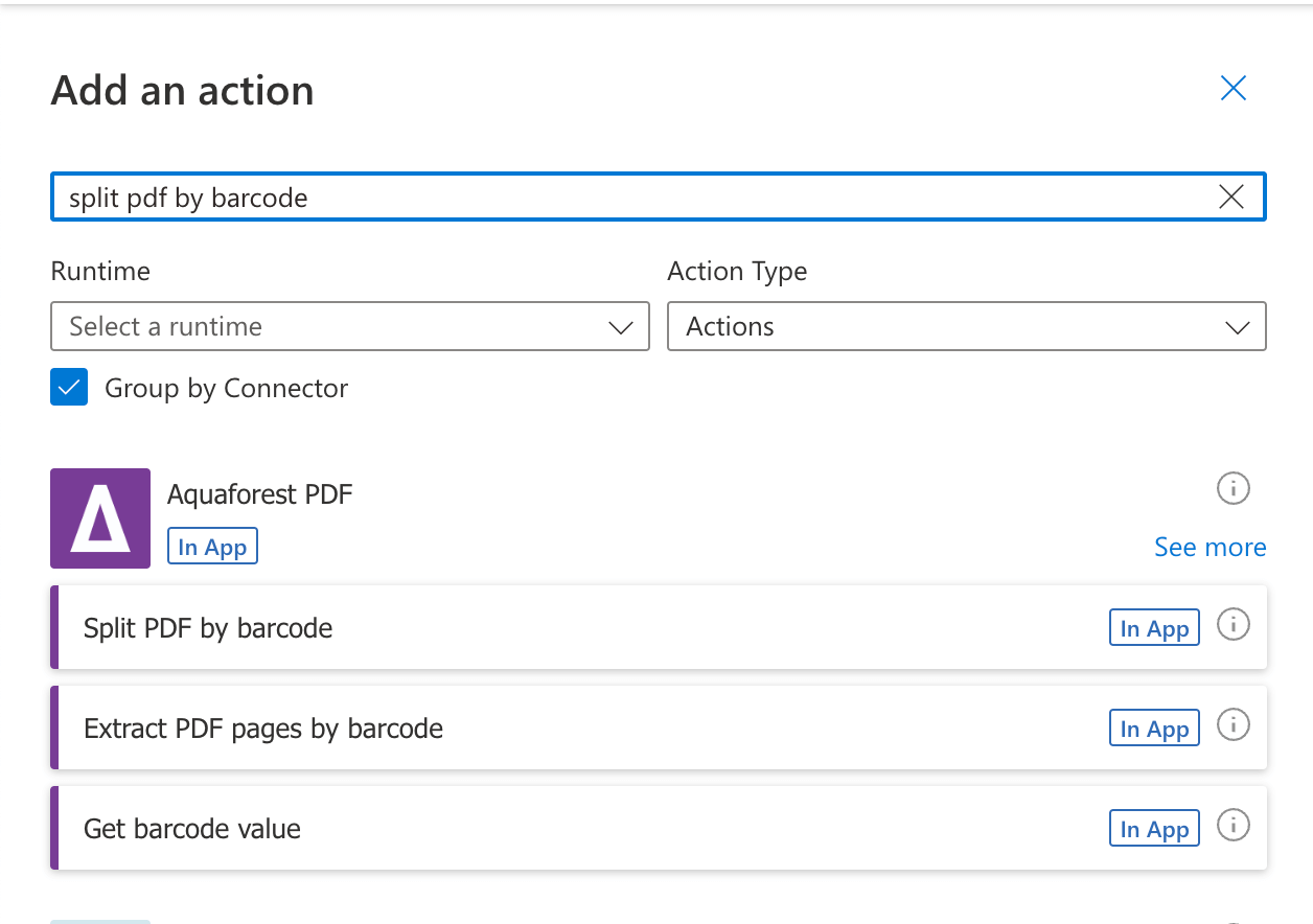 Click the + button to add a new action, and in the search bar, type split pdf by barcode.