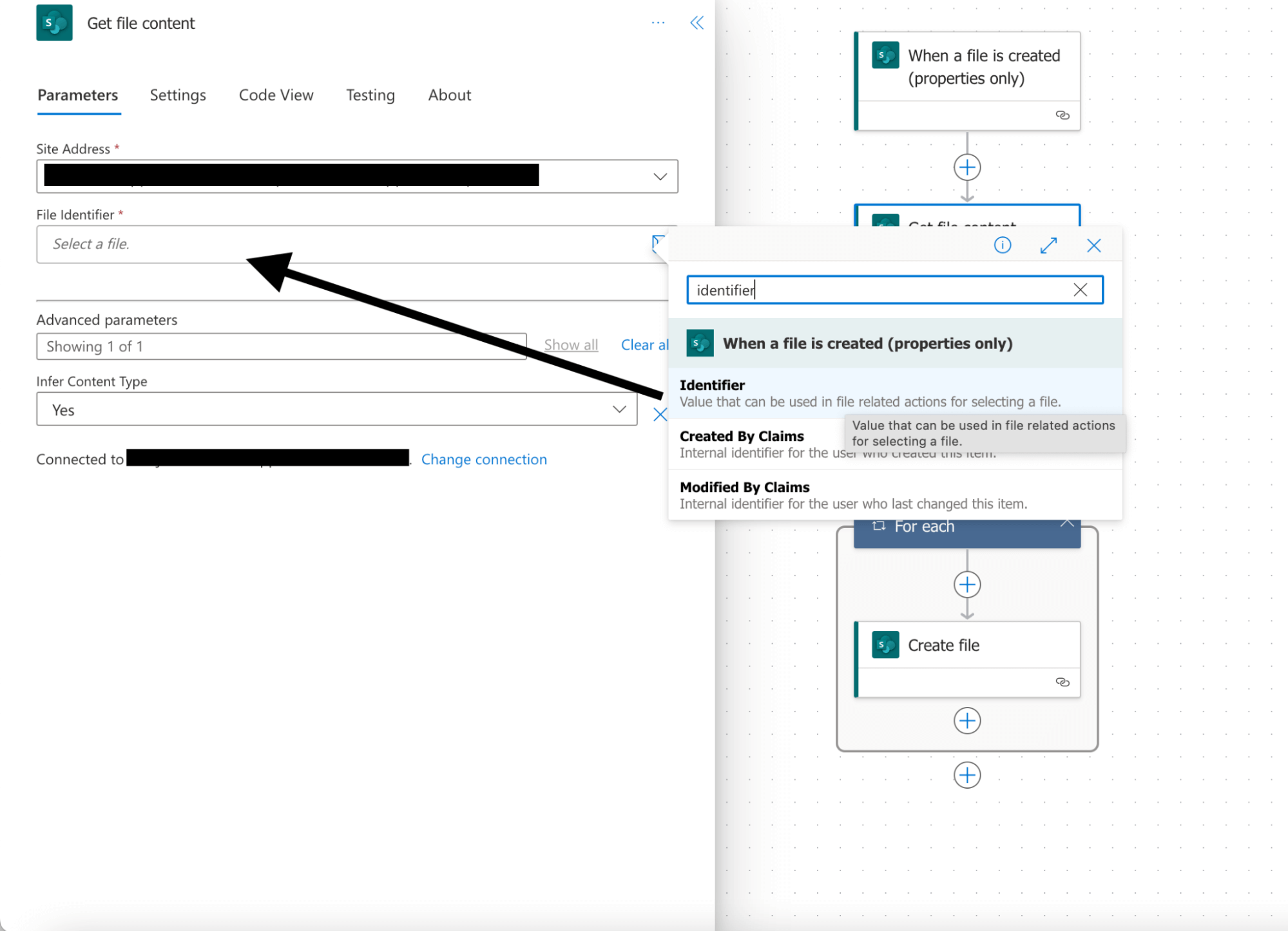 For this example, choose the Automated cloud flow and set the When a file is created (properties only) trigger. This trigger is activated when an item is created or modified in a library. As it returns only the properties stored in the library columns, you need to add a Get file content step and use the Identifier property returned by this action to get to the contents of the file.