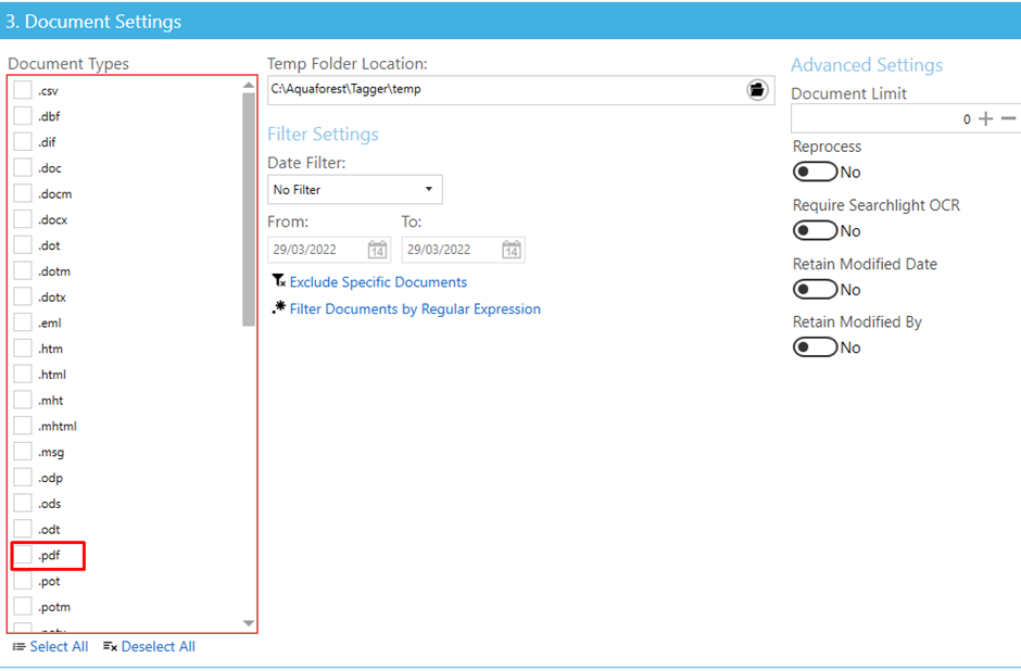 Now that our location is added, it is time to setup the document settings. There are quite a few settings here, but for this blog, all I will be changing is the option to enable “PDF”s to be processed.