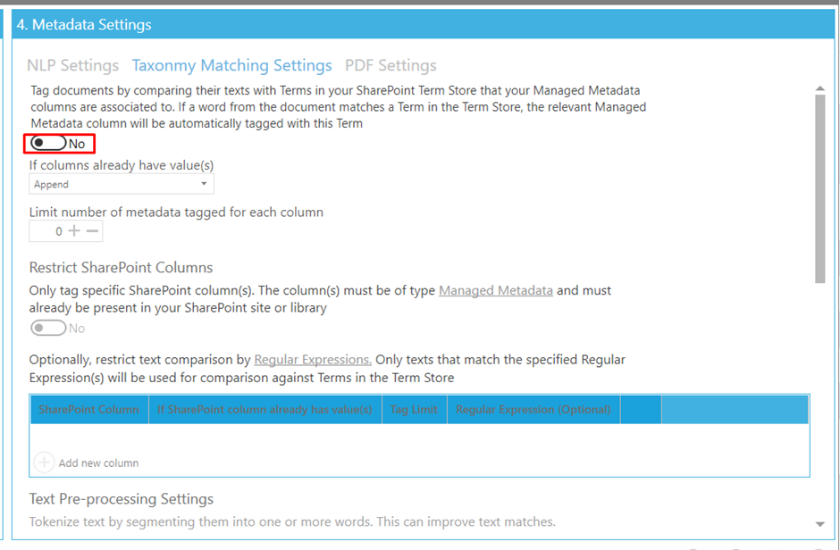 Now we are onto the focus of this blog. In the Metadata settings, you will want to go to the “Taxonomy Matching Settings” and enable this setting.