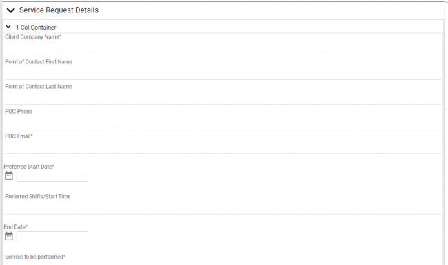 This workflow begins when a customer fills out the Service Request form, pictured below. This form includes details about the service to be performed, the needed date, and client information. The service to be performed answer could be listed in a drop-down list as well to easily drill down what resources will be needed from your organization.