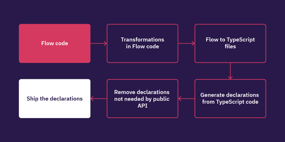 Our internal codebase is written in Flow(opens in a new tab), so there was no straightforward way to provide TypeScript declarations. The easiest way of generating declarations is to write them manually, but it would have been hard to keep them up to date, as every time a public API changed, we would have had to make sure our declarations were updated. There was also no automatic way of knowing if they needed updating without going through things manually, so this would have been a tedious task.