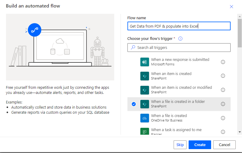 - Give is a name “Get data from PDF & Populate into Excel-