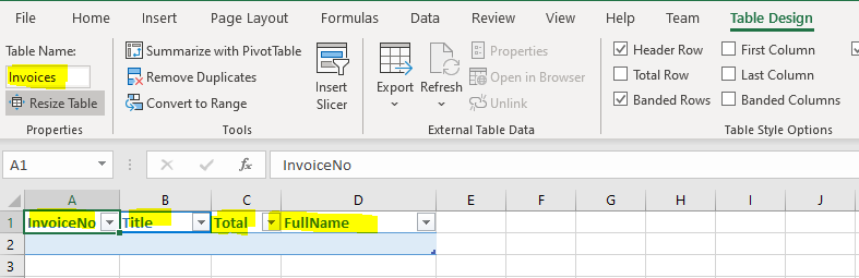 - Give the Table a Name: “Invoices”