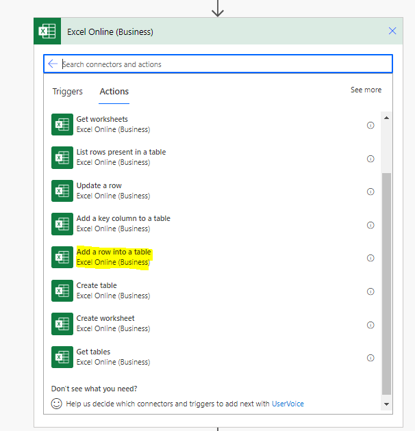 Add new Step “Excel Online - Add a row into a Table”