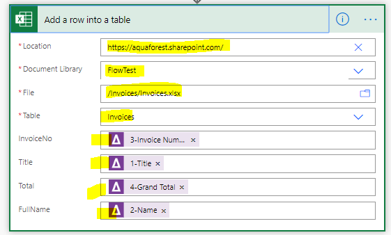 Populate the “Add a row into Table” step as follows