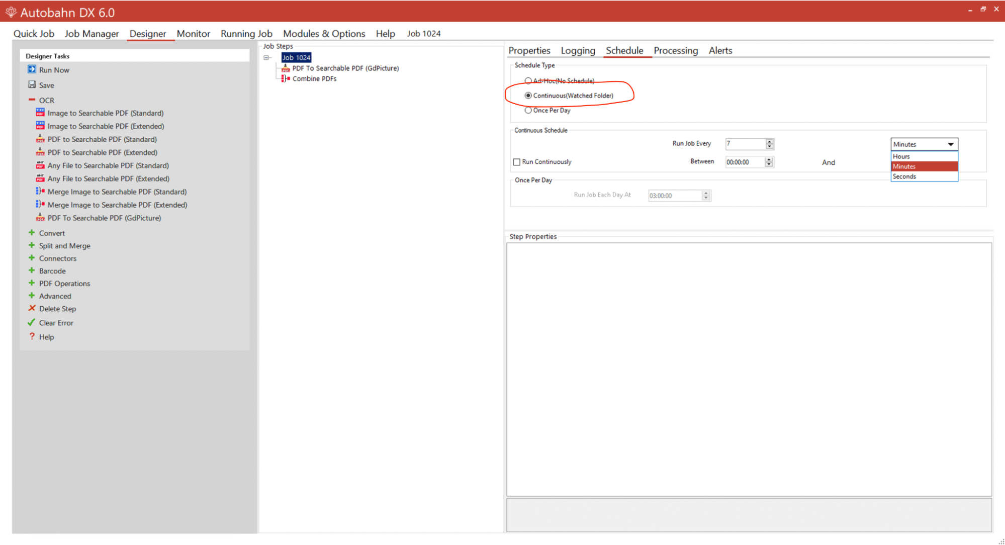 As the default option, the job type will be set as ad hoc, which means it needs to be run manually. But in this instance, you want it to be processed automatically. Go back to the Designer and then to the Schedule tab. You can choose to use the once-per-day option, or you can use the **Continuous (Watched Folder)**option and set this job to run by the hour, minute, or second. This example sets the job to run once every minute. However, in practice, if you have larger sets of files, we recommend doing larger intervals. 6. Set the input files to move to an archive.