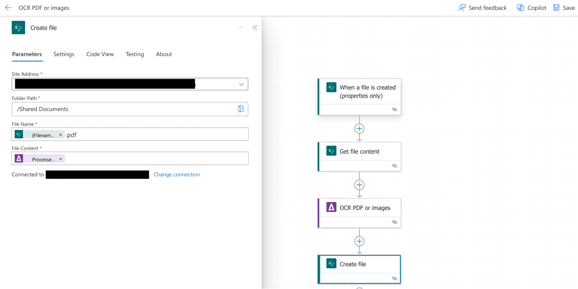 Folder path: The location of your SharePoint library where the output file will be stored. You need to store the OCRed PDF file into a different folder, or otherwise it will create an indefinite loop and the flow will be running all the time.