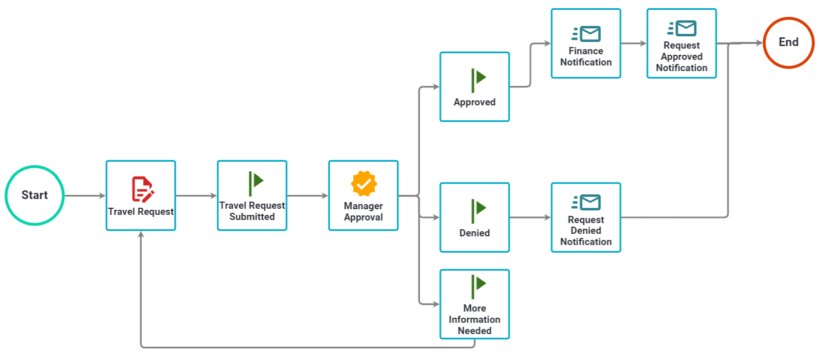 Nutrient Workflow has prebuilt Process Apps(opens in a new tab) for our customers that are entirely free to download. One of those is the travel request process(opens in a new tab). Below, you can see the prebuilt form and workflow for this process. In this example, after your employee fills out the travel request form, it’ll be routed to their manager for approval. It’ll notify finance, send appropriate notifications throughout, and end the process. With this process and any of our Process Apps, you can customize it to fit your organization’s needs. Each employee who starts their request will run through this process similarly, ensuring consistency and compliance.