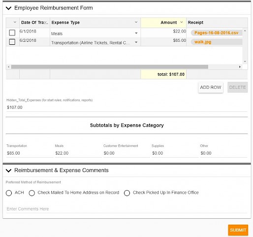 There are two forms involved in the process, one for the employee to complete and one for Accounts Payable. We included a flexible line-item section for the employee to add each expense and attach a receipt. The amounts total automatically by category. The process is straightforward, requiring only the employee’s manager to approve. Additional approval steps can easily be added, of course.