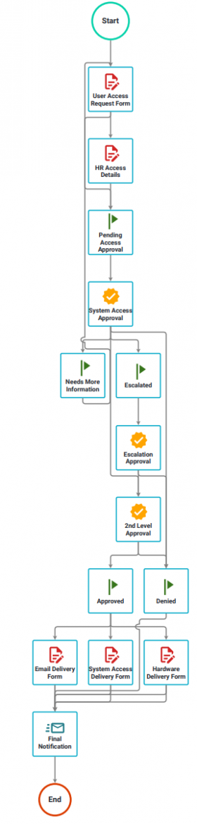 Automating user access requests(opens in a new tab) for software can help streamline the process of granting access to specific systems or applications. This Nutrient Workflow process allows a user to request access to software and systems and comes prebuilt. The form you see below includes questions about the user and the type of access they need, including a separate form for any HR access needs. The process provides two levels of approval with approver options for rejecting the request. It also allows for a delivery date to be submitted for each type of access. Additionally, automation can help reduce the workload on IT teams, who would otherwise need to manually process each user access request.