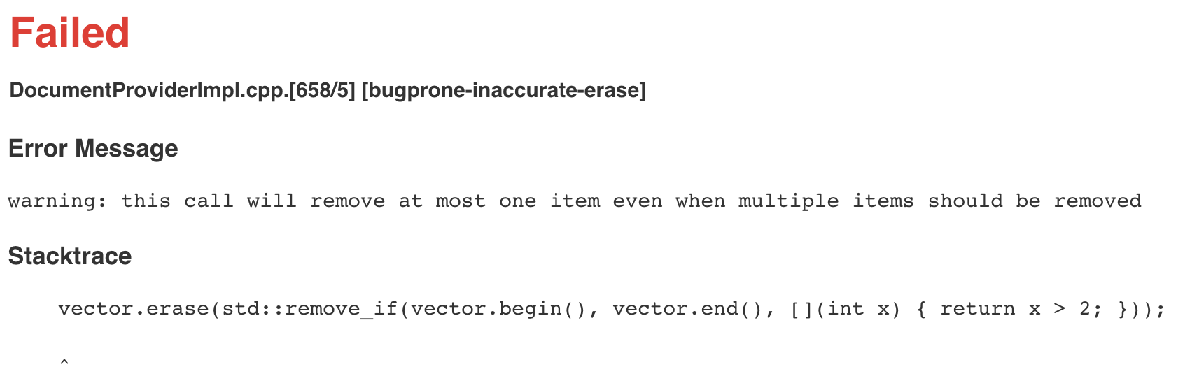 std::remove(opens in a new tab) and std::remove_if(opens in a new tab) can be very useful. But let’s be honest, how often did you forget to also call std::vector::erase(opens in a new tab)? For me, the answer is: basically every time, until hopefully my unit tests yell at me for forgetting it once again. Using this check, there’s another safety net to make sure this wasn’t forgotten.