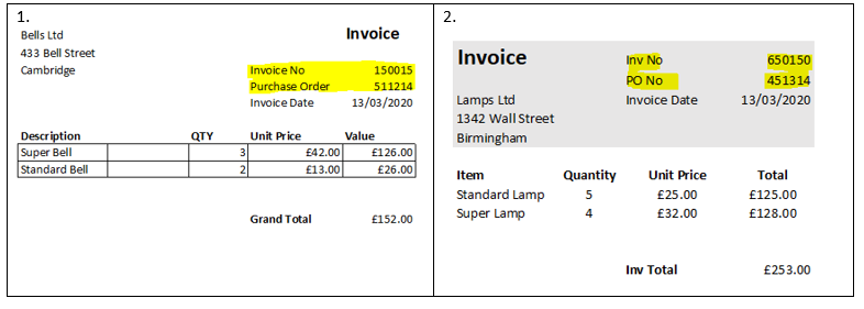In this article, we will explain how to setup Synonyms in JSON within our “Get Data from PDF” Power Automate PDF Connector. From the example invoices below, we want to extract the following named Name-Value Pairs, “Invoice No/Inv No” & _ “Purchase Order/PO No” _. The invoices are different layouts & have different entity names for these fields.