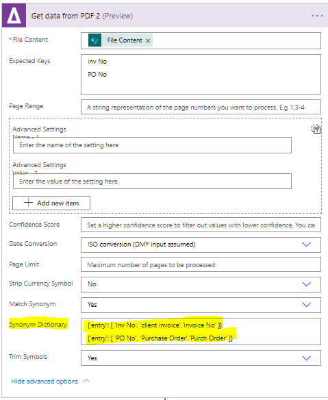 You then add this to the “Synonym Dictionary” in the “Get Data from PDF”, “Advanced Options”