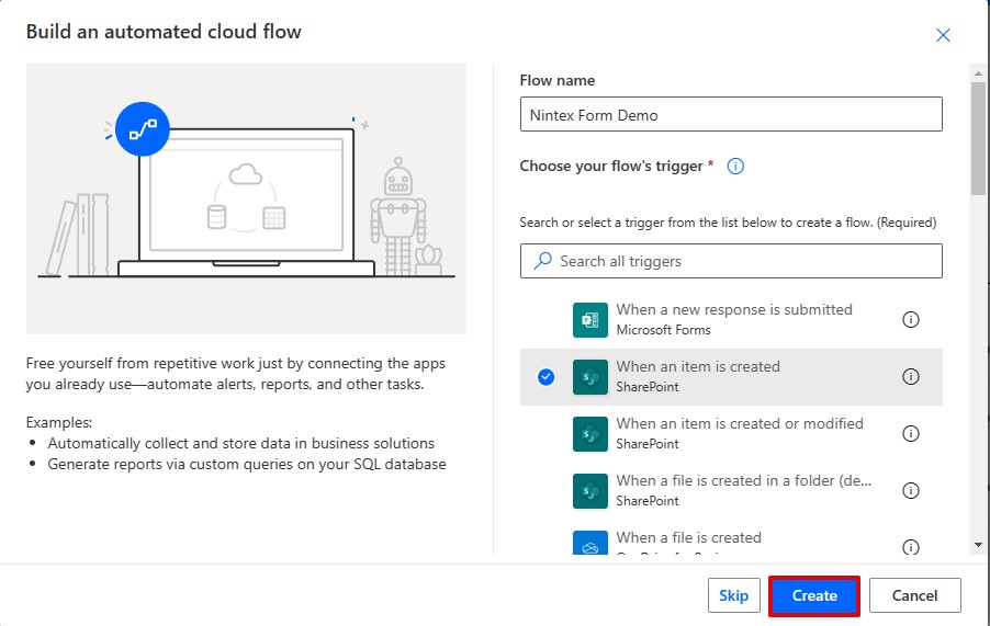 Enter a meaningful name for the flow in the Flow name field and select the When an item is created MS SharePoint trigger. Then click Create.