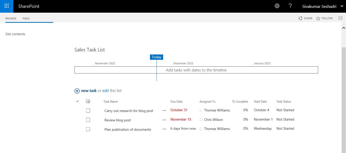 You can use a simple Tasks list for this. If you do not have one, feel free to create one (Sales Task List) by navigating to your MS SharePoint site and adding a ‘Tasks’ app. If you use the MS SharePoint Form’s default view, the PDF file generated will also have all the SharePoint User Interface’s Quick Launch menu as well. To have the MS SharePoint Form without the Quick Launch menu, you can create a Form that displays all items in the list with as little of the SharePoint User Interface around it as possible.