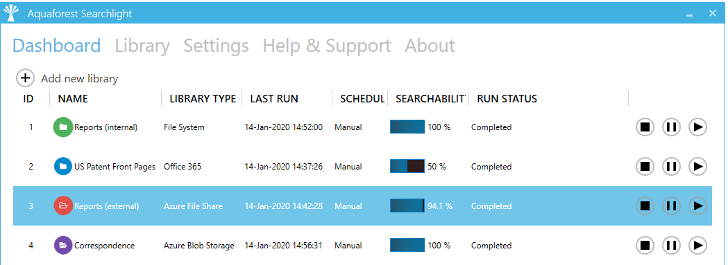 | Run Status | Current status of the document library: - Running - Completed - Error - Aborted |