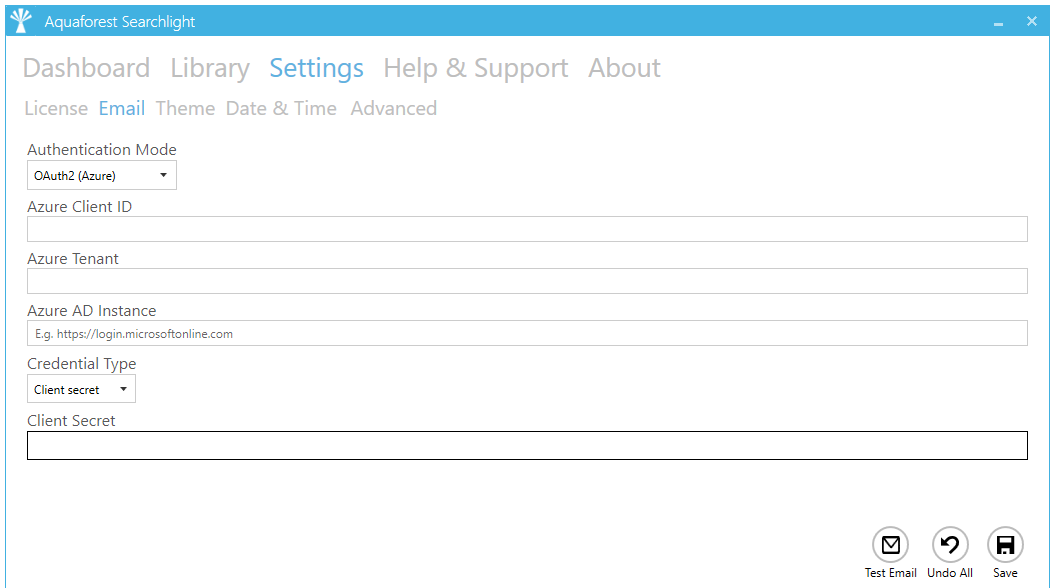 The Email tab allows email server information to be defined. This is used to support the “Email Alerts” functionality. Document Searchability supports two authentication modes: SMTP and Azure OAuth2.