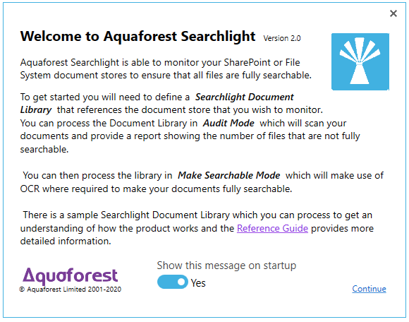 When Document Searchability is launched for the very first time, a Welcome page is displayed to introduce the user to the different features of Document Searchability and help in creating the first document library.