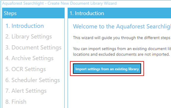 Document Searchability also provides the ability to import settings from an existing library. However, “locations”, “excluded locations” and “excluded documents” are not imported because it is not allowed to have the same locations in multiple libraries.