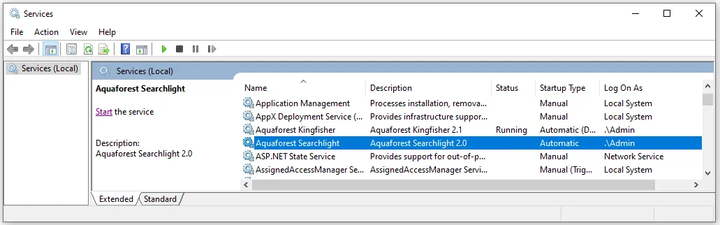 - Select and double-click on the Aquaforest Searchlight service to bring up the Aquaforest Searchlight Properties dialog.