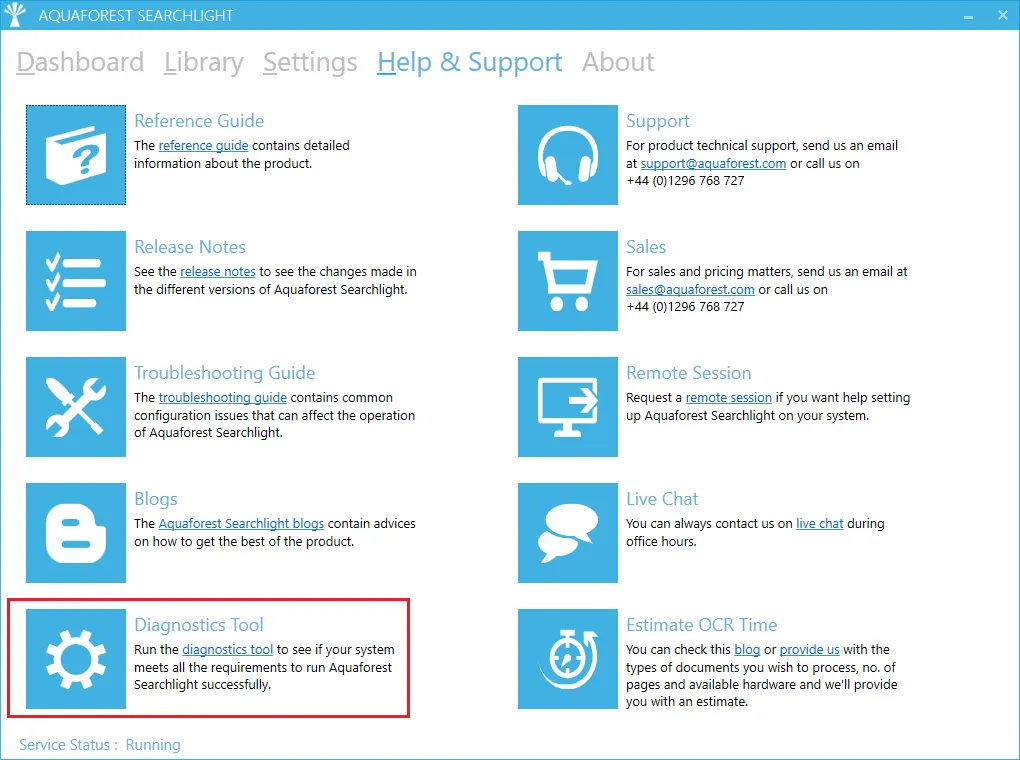 Once installed you can run the ‘Diagnostic Tool’ which can be accessed from the ‘Help & Support’ tab on the main screen.