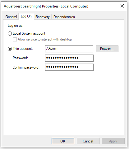 - Select and double-click on the Aquaforest Searchlight service to bring up the Aquaforest Searchlight Properties dialog.