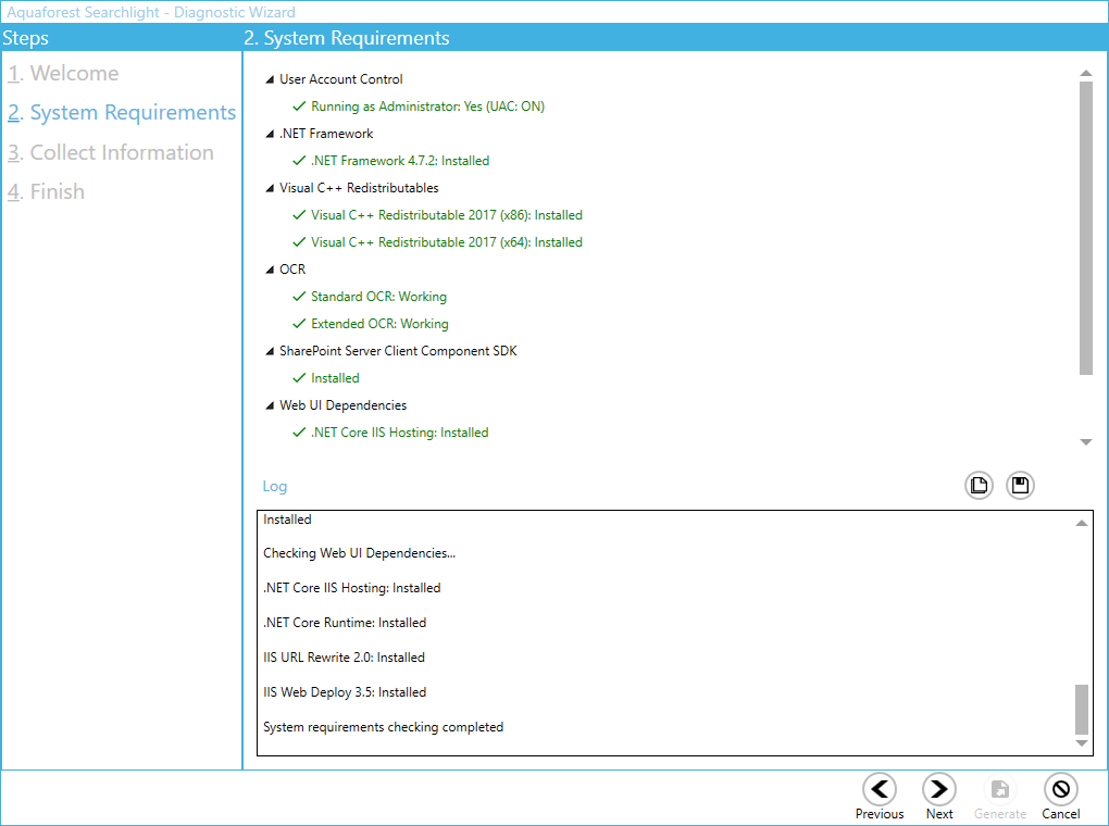 This will initiate the diagnostic wizard which will run various checks to determine if your system meets all the requirements needed to run Document Searchability. If you notice any failures during the run contact the support team.