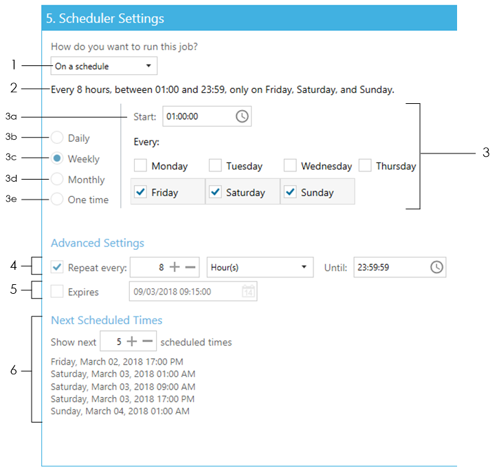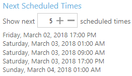 Update this to view the next ‘x’ scheduled times (from the current time) that the job will run based on the scheduler settings specified.