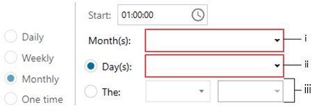 Monthly – Choose this if you want to run the job monthly on specific dates or days of the week.