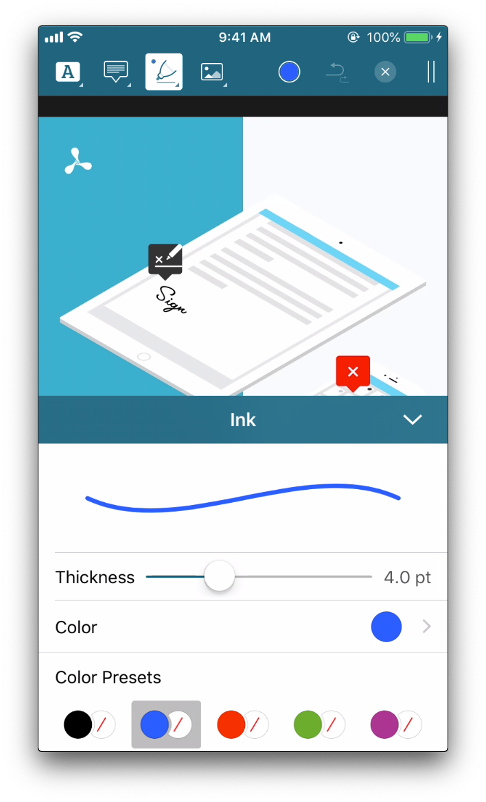// We need to explicitly use `@convention(block)`, as the `Array` is `id` typed.typealias AnnotationStyleBlock = @convention(block) (Annotation) -> [[AnnotationStyle.Key]]let styleBlock: AnnotationStyleBlock = { annotation in return [[AnnotationStyle.Key.color, AnnotationStyle.Key.fillColor]]}// Casting the Swift closure to `AnyObject`, since closures in Swift are not directly converted to Objective-C closures.let blockObject = unsafeBitCast(styleBlock, to: AnyObject.self)annotationProperties[.ink] = blockObjectPSPDFAnnotationStyleBlock styleBlock = ^PSPDFAnnotationStyleKeyGroupedList (PSPDFAnnotation *annotation) { return @[@[PSPDFAnnotationStyleKeyColor, PSPDFAnnotationStyleKeyFillColor]];};annotationProperties[PSPDFAnnotationStringSquare] = styleBlock;To customize the color presets in the style inspector, check out our customizing color presets guide.