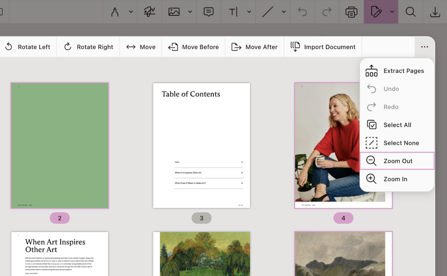 The document view thumbnails size can be controlled by using the dedicated zoom control buttons in the toolbar or by using the keyboard shortcuts Command/Control + and Command/Control -, or Command/Control 0 to reset to the default thumbnail size.