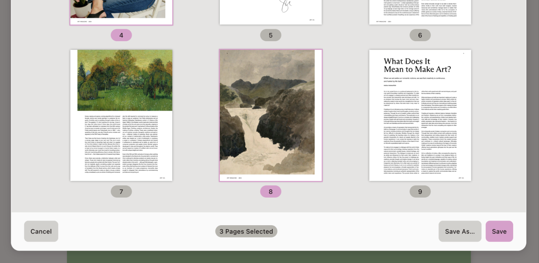 The document view is a vertically scrollable grid that represents all the pages in an edited document. Pages can be selected or deselected by single-pressing a page’s thumbnail. It’s possible to select more than one page at the same time. You can identify selected pages by paying attention to the thumbnail outline.