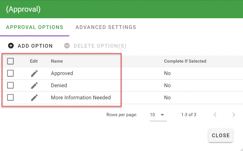 Let’s give the person approving the request these options to choose from: “Approved,” “Denied,” “More Information Needed.”