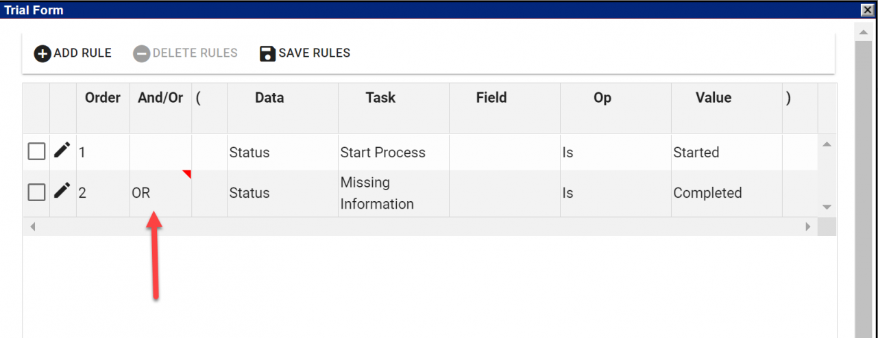 - Hover over the Form task and select Configuration / Configure Rules. The “Configure Rules” window will come up showing two rules, one for people starting the process and one for people for whom “More Information is Needed.” We’ll want to change the “AND” to an “OR.”