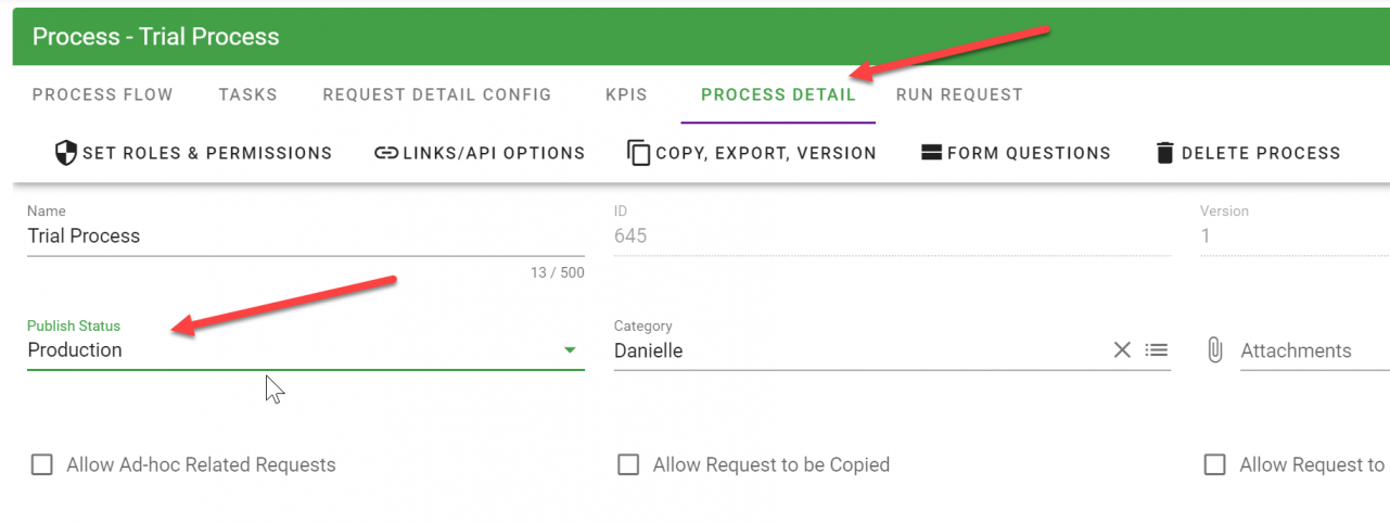In order for end-users to be able to see the process and start a request, you need to move it into Production. Here’s how: