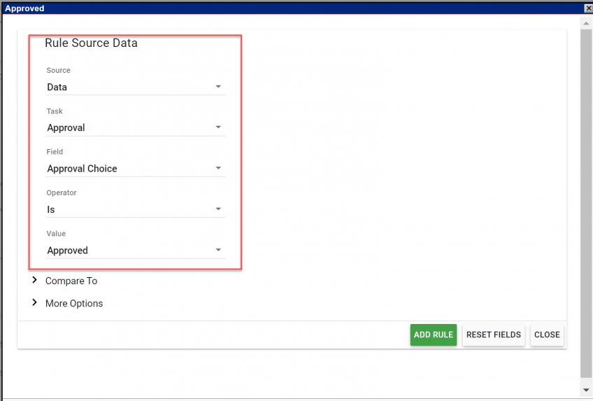 OK, this is where you have a lot of options but let’s keep it simple. We just want to add a rule that looks at the Approval task and checks if “Approved” was selected by the Approver.