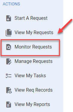 The Monitor permission will enable the user to have access to the Monitor Requests menu item under the Actions navigation menu: