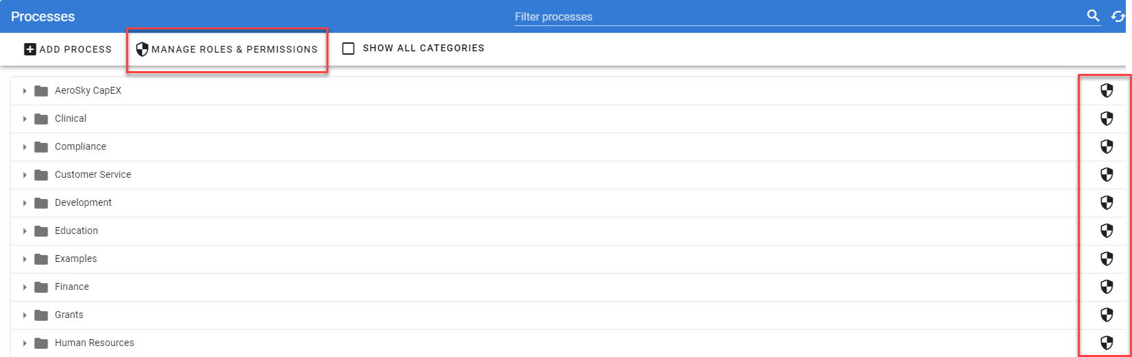 You will also notice that the Set Roles & Permissions icon is made available at the top of the process list and then for each individual category that contains a process. You can only create roles at this top Process Category level. For the levels below this level, you can only assign roles.